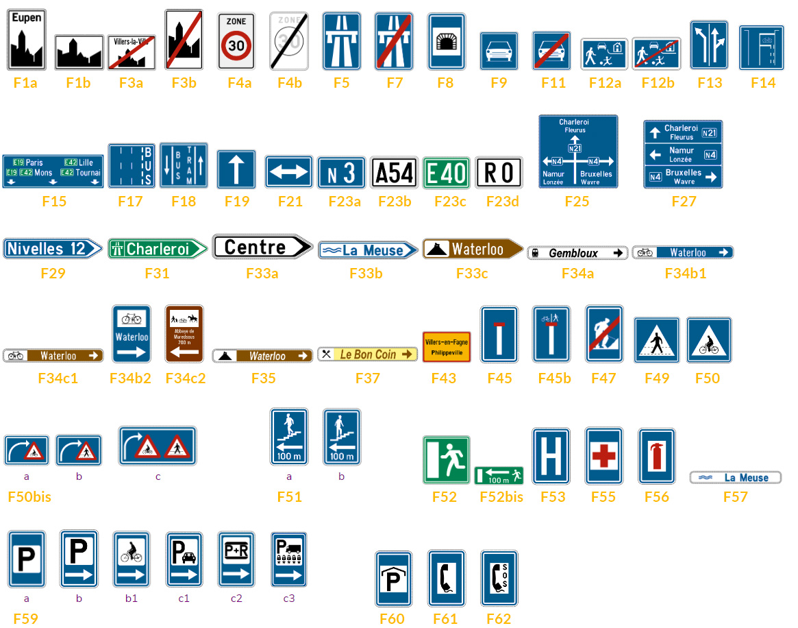 Les panneaux sont nombreux et variables. Ils sont reconnaissables (pour la plupart) grâce à leur forme et leur couleur.